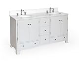 This classic bathroom vanity set includes a white cabinet with soft close drawers, natural marble stone countertop, double undermount ceramic sinks, two pop-up drains, two P-traps, and two chrome three-hole faucets. Pictured backsplash not included! Dimensions: 60 inches wide x 23 inches deep x 35 inches high. All vanities come fully assembled by the manufacturer, with countertop & sinks pre-installed. ***Due to the natural characteristics of the stone, the color and/or pattern of each countertop may vary from the pictures. No two slabs of marble are the same! This is 100% natural marble stone originating from China. There may be "glitter" speckles, tan and/or gray veining/spots, as this is a natural stone and no two units are the same. Order now get a free matching marble backsplash! (Please note that the backsplash is not included in the purchase price and will be shipped with your purchase as a free upgrade only. In the event that the backsplash is received damaged or broken, it will not be refunded for or replaced.) Read more