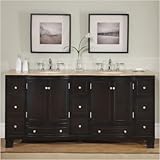 HYP-0703-T-UIC-72 Complete any bathroom with the simple yet elegant Merrimack vanity. This exceptional piece features four doors, eleven drawers, and elegant curving on its front panel. Features: -Double bathroom vanity. -Brushed chrome finished hardware. -Material: Wood, CARB Ph2 certified plywood and MDF panels, stone, ceramic. -Transitional styling. -Comes with ivory undermount ceramic sinks and a travertine stone top. -Espresso finish. -Pre-drilled for 3-hole, 8-inch widespread faucet(s). -Faucet(s) not included. Specifications: -Manufacturer provides 30 days warranty. -Center-to-center: 30.5''. -Overall dimensions: 36'' H x 72'' W x 22'' D. Read more