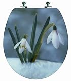 Round White GlaxitzTM Designer Toilet Seat with Snowdrop Flowers and Chromed Metal Hinges